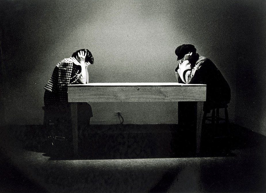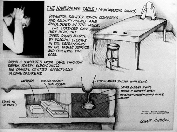 “In the end, I liked the way listening to the table, head in hands, was the same body posture as the moment of inspiration and depression that initiated the project. I recently redesigned the table, updating the electronics and am happy that it retains its eerie presence: a resonance that seems more remembered or imagined than heard.” (Laurie Anderson)